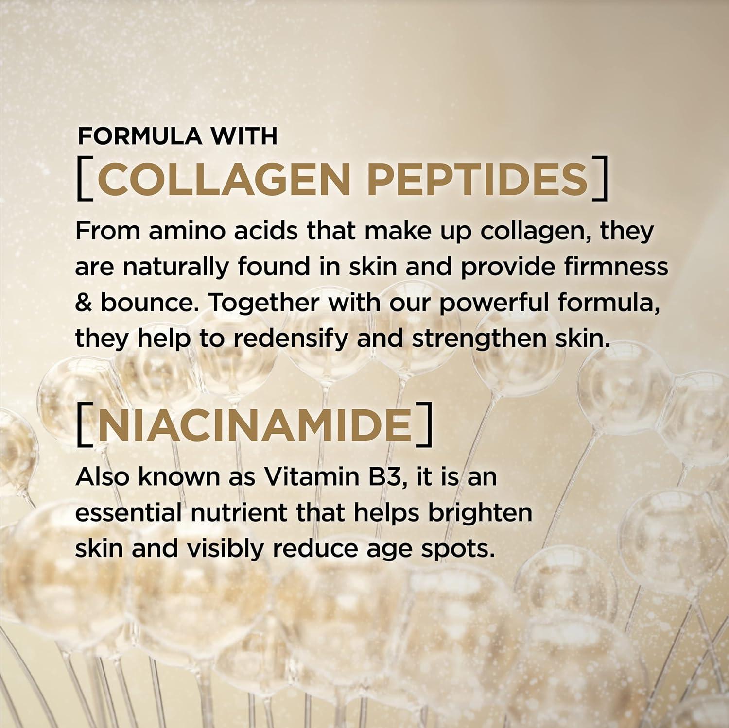 RETIGHTENED, DENSER, MORE EVEN SKIN! Age Perfect Collagen Expert Day Moisturizer provides a daily boost of Collagen Peptides + Niacinamide to intensely rehydrate and redensify maturing skin. Formulated with Broad Spectrum SPF 30 Sunscreen, this formula also helps protect against two types of UV rays (UVA/UVB) that cause skin damage and premature aging. Paraben free. Mineral oil free. Allergy tested. Suitable for even sensitive skin. WHAT IS COLLAGEN? Collagen is a natural protein abundantly present in the skin. It provides skin’s strength, firmness, and bounce. After 50, the skin’s collagen production slows which can lead to loss of volume and sagging. WHAT ARE PEPTIDES? Recommended by dermatologists, peptides are the building blocks of collagen and are key for its natural production in the skin. Our collagen peptides, along with the other ingredients in our powerful formula, help lock in moisture, redensify and retighten skin. WHAT IS NIACINAMIDE? Also known as Vitamin B3, this essential nutrient helps to brighten skin overall and to reduce age spots. VISIBLE RESULTS After 1 use, skin is intensely rehydrated and nourished. After 4 weeks, skin feels stronger, denser and contours appear more toned. Skin’s radiance and brightness also improve, while overall complexion appears healthier. HYDRATING, NON-GREASY TEXTURE: This lightweight face cream provides all-day hydration. It absorbs quickly and doesn’t leave a greasy or sticky finish.