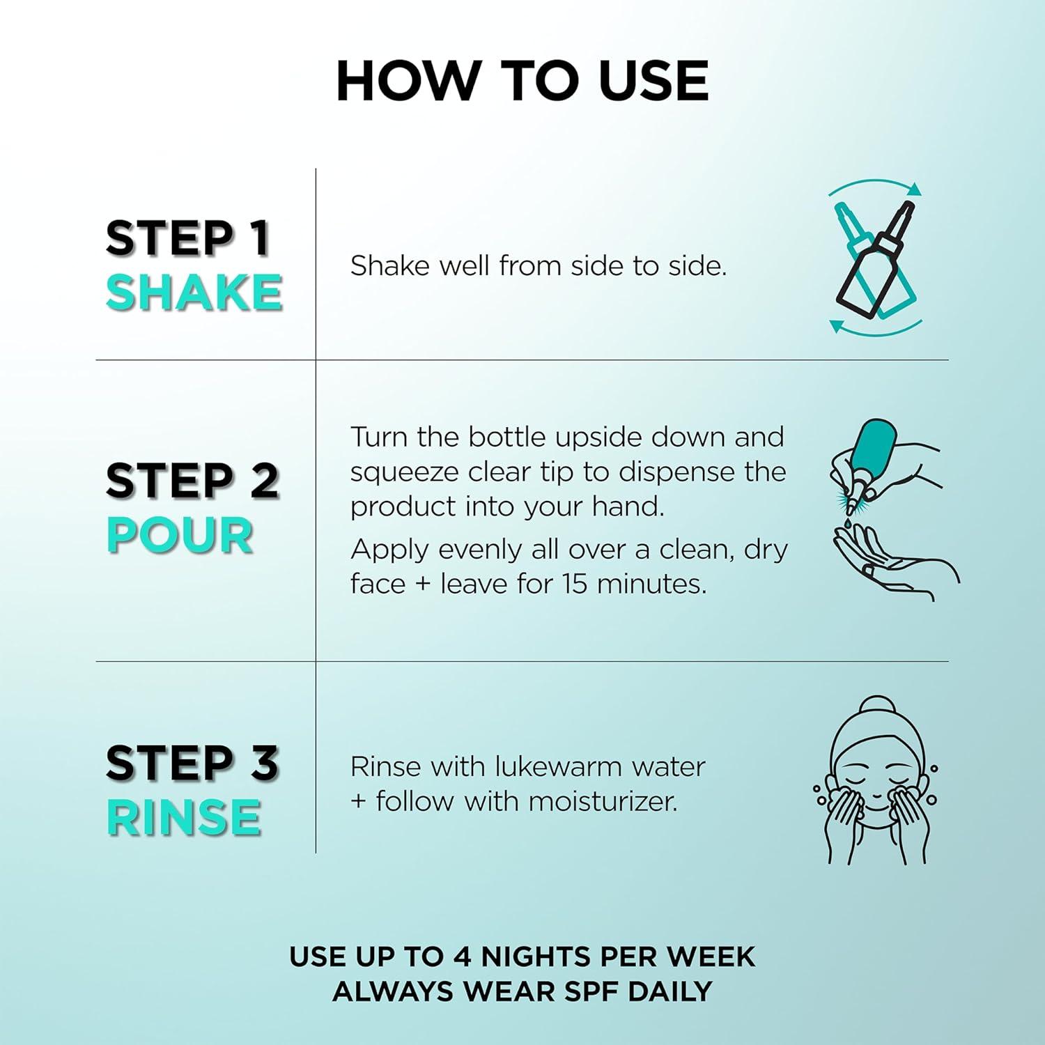 For Best Use: Shake from side to side. Turn bottle upside down, squeeze clear tip to dispense product. Apply all over a clean, dry face & leave for 15mins. Rinse with lukewarm water. Follow with moisturizer. Apply a minimum SPF 30 sunscreen every day