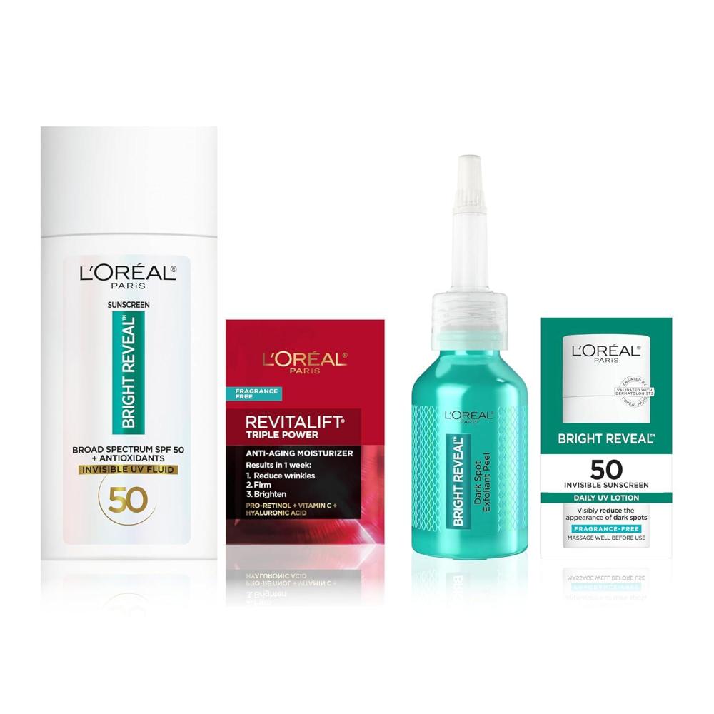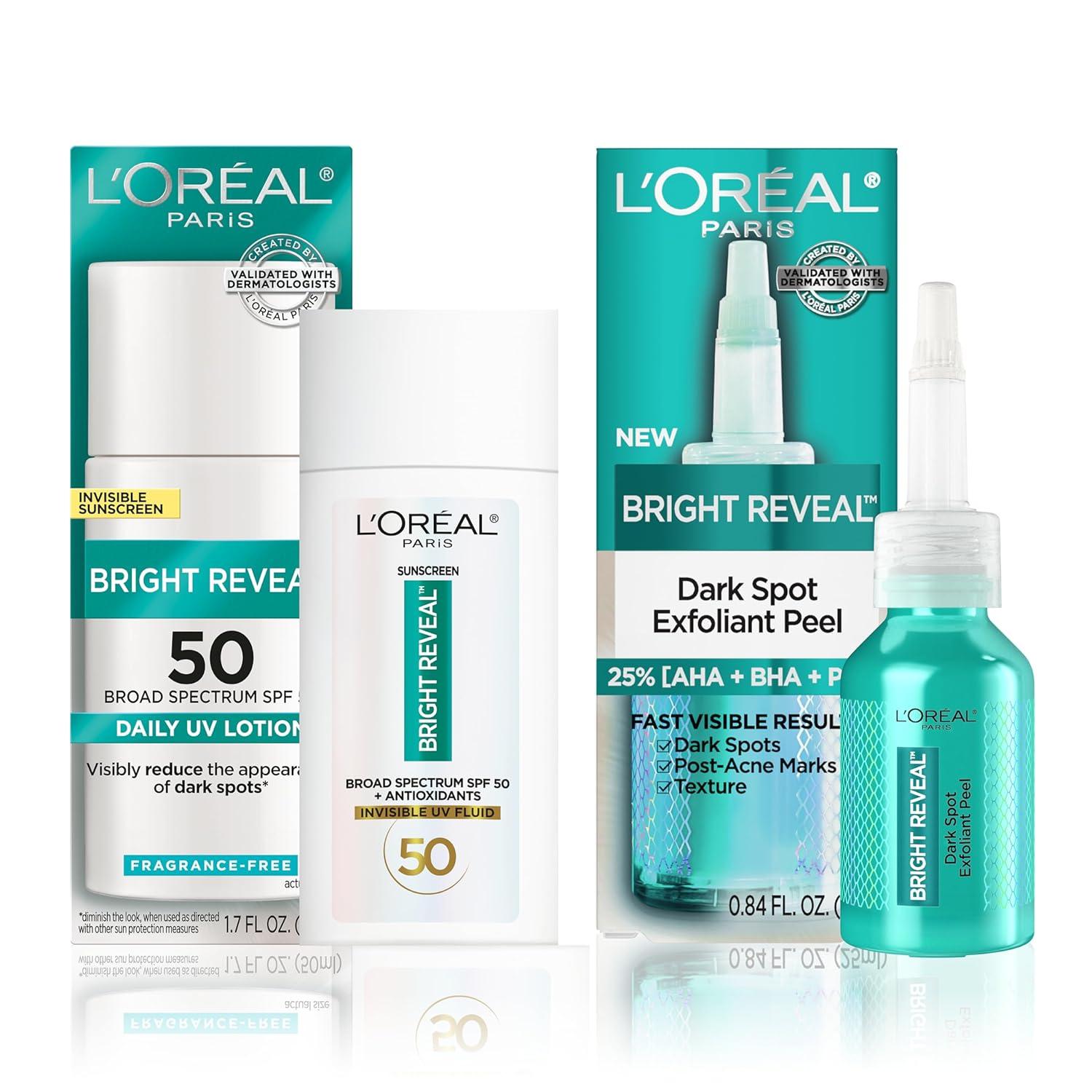L'Oreal Paris Bright Reveal Exfoliant Peel + Broad Spectrum Daily UV Lotion SPF 50, 1 kit. *in a consumer study (86 women), 96% of participants agreed **in 4 uses (1 week), skin's upper surface layers versus 30% glycolic peel (professional use only)