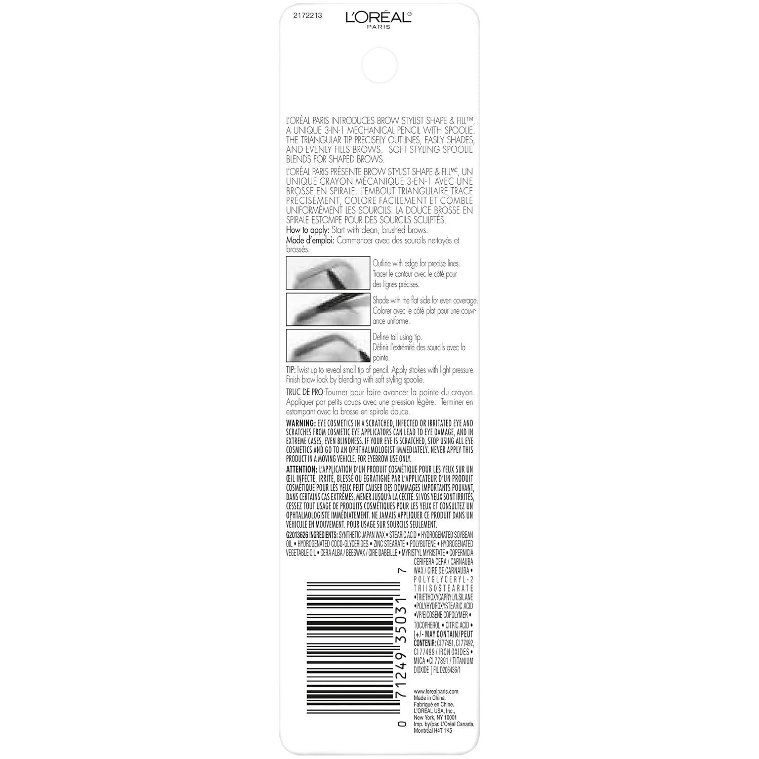Define your brow statement. Brow Stylist Shape and Fill is a unique 3-in-1 mechanical pencil with spoolie. The triangular tip precisely outlines, easily shades, and evenly fills brows. Soft styling spoolie blends for shaped brows. Packaging may vary. What you receive may not be what is reflected on site. Packaging May Vary