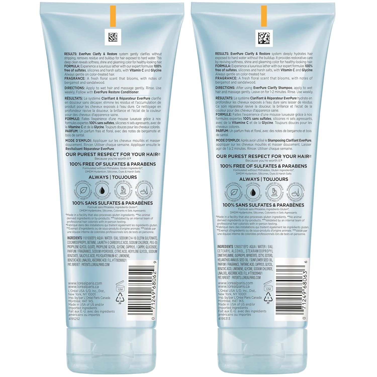 Get a hair detox without compromising your color! EverPure Anti-fade Clarifying Shampoo and Restoring Conditioner features non-stripping, dual action technology, with Antioxidants Vitamin C and Glycine, to remove unwanted hair residue and styling build-up while delivering 2x moisture* vs non conditioning shampoo. For salon results at home, apply EverPure Clarify Shampoo to wet hair and massage gently. Rinse. Follow with EverPure Restore Conditioner. Apply to wet hair and massage gently. Leave on for 1-2 minutes. Rinse. Use weekly. For your brightest and strongest hair color, alternate between EverPure Sulfate free Clarify Shampoo and Conditioner regimen and the EverPure Sulfate Free Bond Repair Shampoo and Conditioner on wash days. EverPure hair products have been formulated without sulfates, parabens, DMDM hydantoin, added phthalates, dyes, and gluten ingredients. Always vegan, color-caring, and powered by science. *Vegan, No animal derived ingredients or by-products, **Gluten Free, made in a facility that also processes gluten.