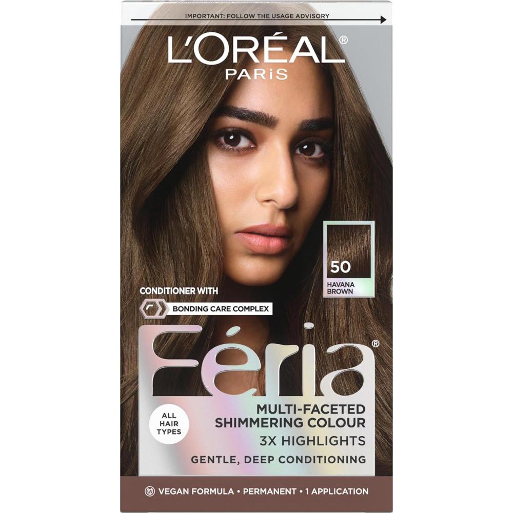 L'Oreal Paris Feria Hyper Platinum Advanced Lightening System Hair Bleach, Lifts Up To 8 Levels, Includes Anti Brass Purple Conditioner, 1 Hair Dye Kit(50 Havana Brown (Medium Brown))