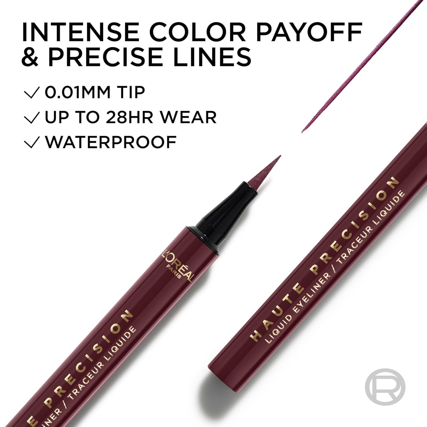 L'Oreal Paris Haute Precision Waterproof Liquid Eyeliner, Smudge-Proof Eye Liner with Micro-Tip, for up to 28HR Eye Makeup Wear, 010 Black Silk(050 BURGUNDY CASHMERE)