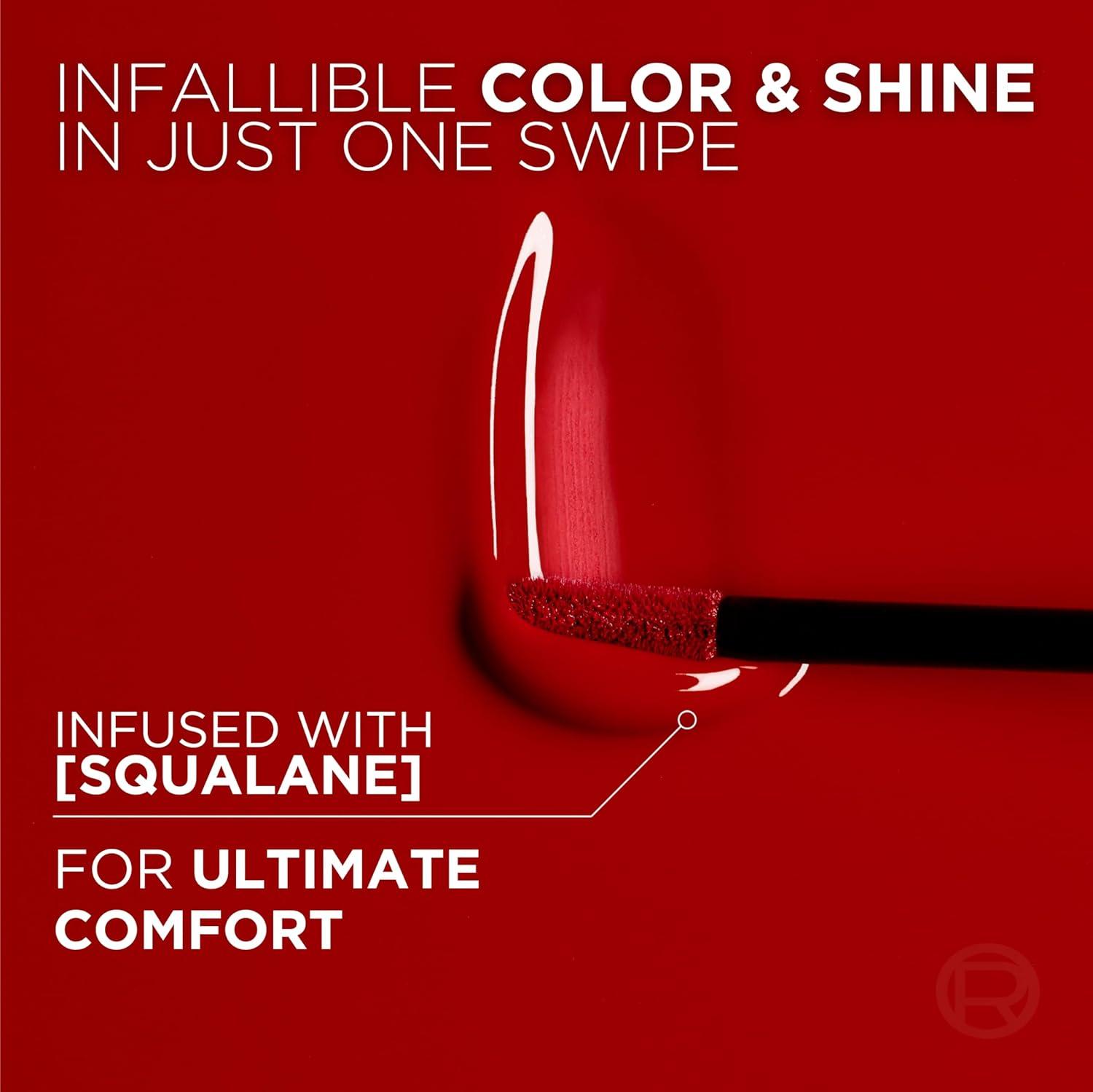 Discover L'Oreal Paris' new lacquer-like shine liquid lipstick that lasts up to 16hr. Film-forming technology seals color for transfer resistant and all day lacquer-like shine with a comfortable lightweight feel. Infused with Squalene. Get bold color payoff in one effortless swipe with an ultra precise applicator. Available in 11 irresistible shades. Shake the bottle for at least 5 seconds before apply and allow to dry. Find your lacquer-like shine today!