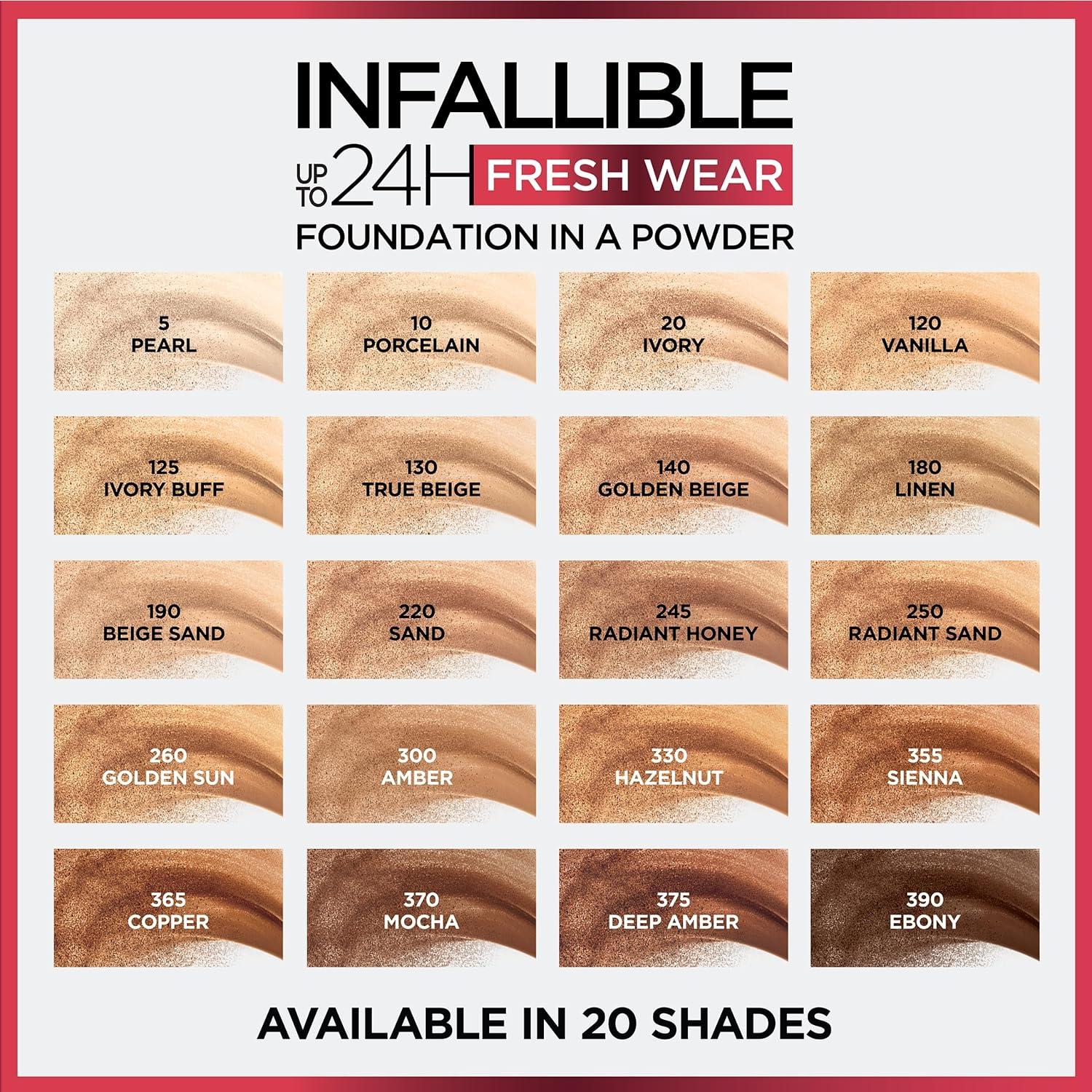 L’Oreal Paris Makeup Infallible Fresh Wear Foundation in a Powder, Up to 24H Wear, Waterproof, True Beige, 0.31 oz.(Amber)