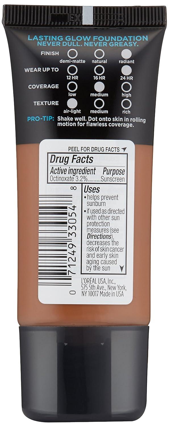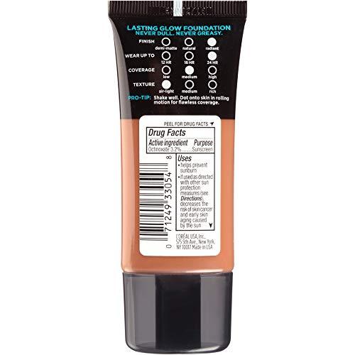 Discover the new pro finish of longwear: up to 24 hour wear with a hydrating glow. Lightweight and creamy, L’Oral Paris' Infallible Pro Glow Foundation is a long lasting foundation that goes on smooth with a glow finish that lasts. Hydrating foundation has medium coverage and instantly hides imperfections for a clear complexion. This luminous foundation with SPF is ideal for normal to dry skin. • Up to 24HR Foundation • Hydrating Glow, Medium Coverage • Healthy, Radiant Finish • The New Pro-Look of Longwear Apply to cheeks, forehead, and chin blending outward. Finish with Infallible Pro-Spray and Set for a lasting glow look. Octinoxate 3.01% Warnings. For external use only. Do not use on damaged or broken skin. When using this product keep out of eyes. Rinse with water to remove. Stop use and ask a doctor if rash occurs. Keep out of reach of children. If swallowed, get medical help or contact a Poison Control Center right away.