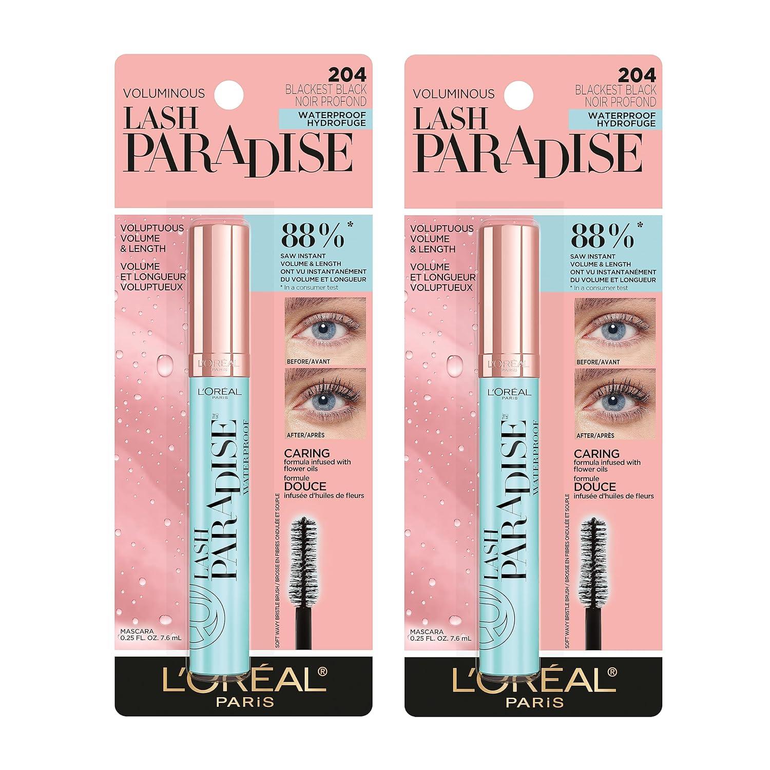 L’Oreal Paris Makeup Voluminous Lash Paradise Mascara, Voluptuous Volume, Intense Length, Feathery Soft Full Lashes, No Flaking, No Smudging, No Clumping, Blackest Black, 0.25 Fl Oz (Pack of 2)(Waterproof Blackest Black)