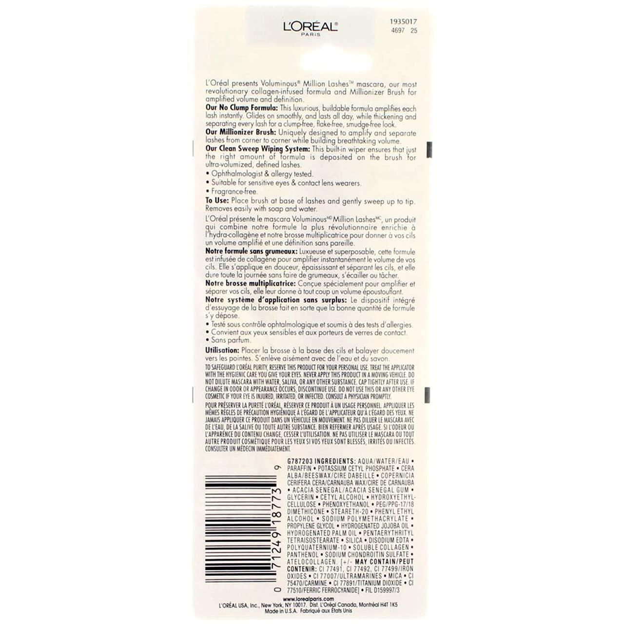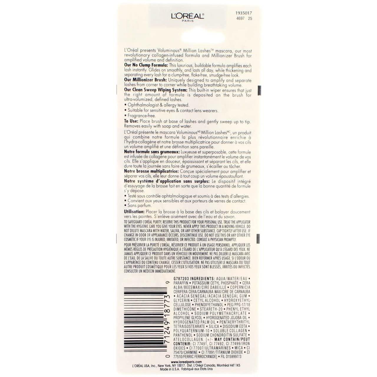 L’Oral Paris Voluminous Million Lashes Mascara creates amplified volume and definition. Our revolutionary collagen infused formula is buildable and amplifies each lash instantly. Glides on smoothly, and lasts all day, while thickening and separating every lash for a clump-free, smudge-free look. The Millionizer Brush is uniquely designed to separate lashes from corner to corner while building breathtaking volume. This defining mascara contains a built-in Clean Sweep Wiping System that wipes the brush free of clumps leaving the perfect amount of mascara for an ultra-volumized clean lash look. Packaging may vary, what you receive may not be what is reflected on site. • Lash by Lash Definition • Amplifying Millionizer brush • Collagen infused formula • Clump-free, Smudge proof mascara Place brush at base of lashes and gently sweep up to tip. Removes easily with soap and water. To safeguard L'Oreal purity, reserve this product for your personal use. Treat the applicator with the hygienic care you give your eyes. Never apply this product in a moving vehicle. Do not dilute mascara with water, saliva, or any other substance. Cap tightly after use. If change in odor or appearance occurs, discontinue use. Do not use this or any other eye cosmetic if your eye is injured, irritated, or infected. Consult a physician promptly.