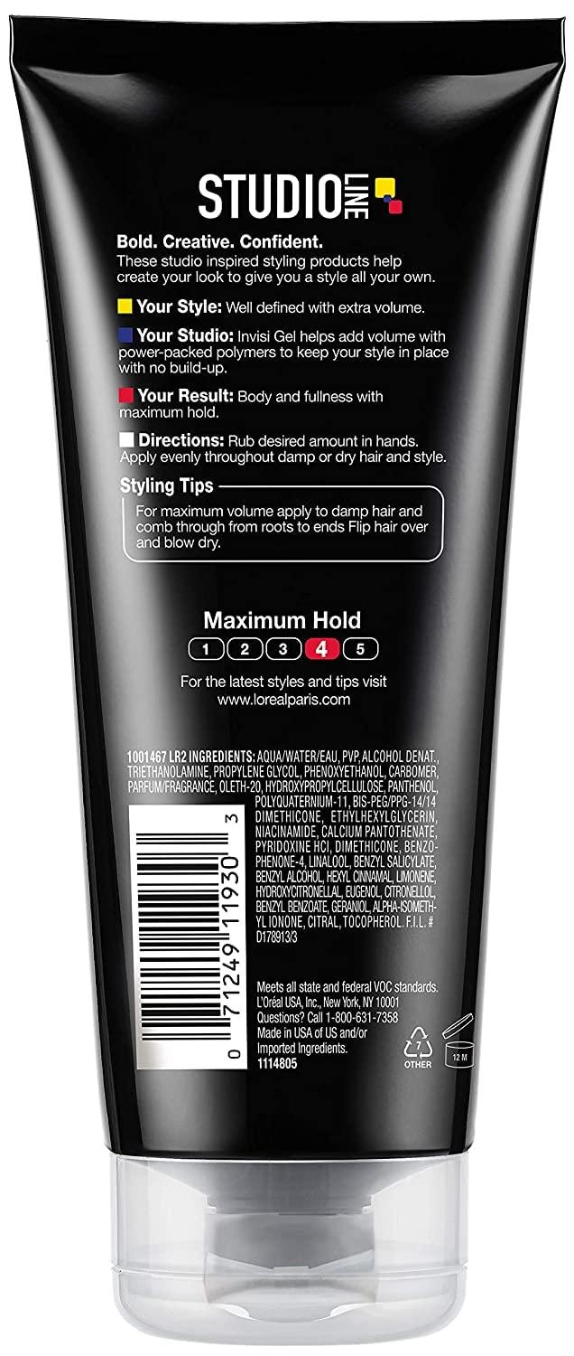 Get a defined, full look with volume, body and maximum hold using the L'Oreal Paris Studio Invisi Gel. This defining hair gel contains a no build-up thickening base to add volume to your hairstyle. For maximum volume, apply to damp hair and comb through from roots to ends. Flip hair over and blow dry. Perfect for short hairstyles and mens hairstyles. • Adds Fullness, Body and Volume • Extreme Hold Defining Hair Gel • No Build-up • Perfect for short hairstyles Rub desired amount in hands. Apply evenly throughout damp or dry hair. Style in any way you choose.