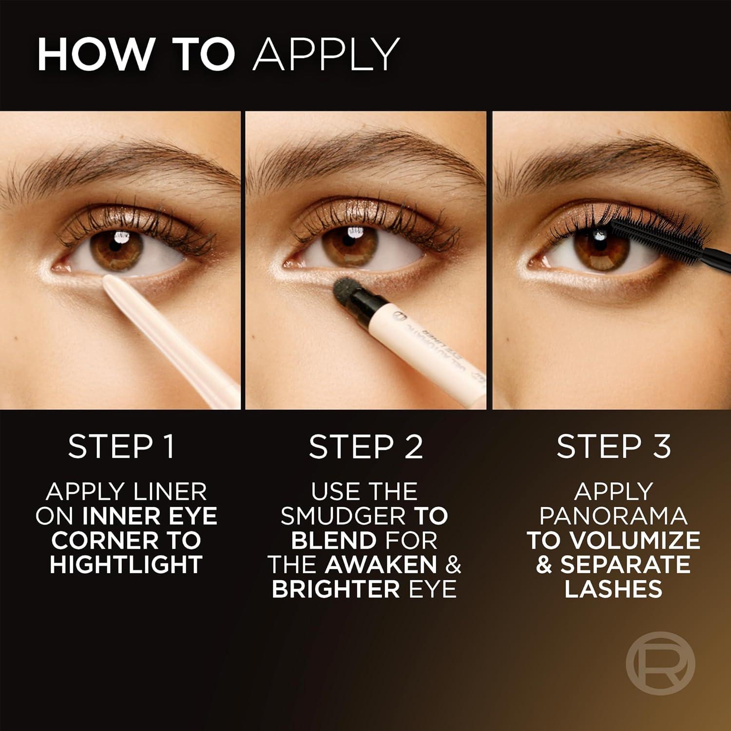Magnify Your Eyes: See corner to corner panoramic lash volume with our Panorama Mascara! Our lightweight and long-lasting mascara for fanned out lashes has been paired with a nude eye liner to create up to 1.4x bigger and 36HR brighter looking eyes